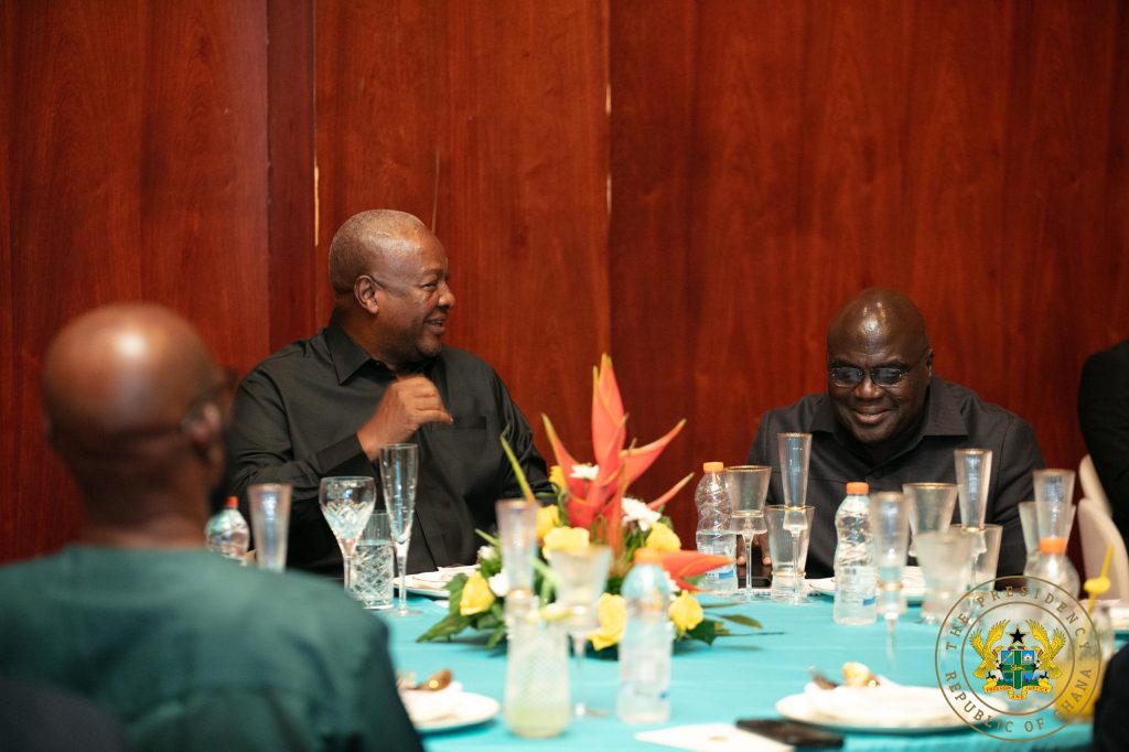 Accra, April 30, GNA – President John Dramani Mahama on Tuesday night hosted Chief Executive Officers (CEOs) of banks and other financial institutions, who participated in the recently held Kwahu Business Forum at a dinner reception at the Presidency in Accra.