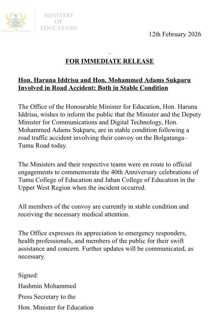 Tumu (UWR), Feb. 12, GNA – Mr Haruna Iddrisu, the Minister of Education, has been involved in road crash on his way to Tumu in the Sissala East Municipality.