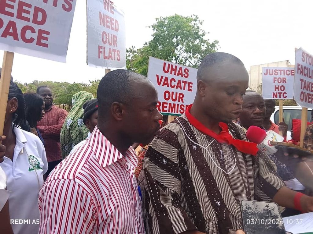 Addressing the media during the protest, Mr Awudi explained that some properties belonging to the Nurses Training College were temporarily handed over to UHAS in 2012 by the late President, Prof. John Evans Atta Mills, to serve as incubator facilities, when the university was newly established.